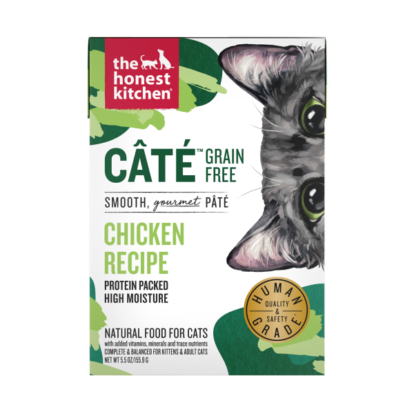 Your cat may have high standards, but it just so happens that the Honest Kitchen does too! That's why they created this 100% human grade, super savory Caté. This chicken recipe is made with delicious cage free chicken using only whole muscle and organ meat. Tasty ingredients. Whole foods. Quality protein. All blended into a rich, luxurious paté your cat will love. And, unlike other paté products, the Honest Kitchen Caté recipes are free of any grain, fillers, GMO ingredients, and more.