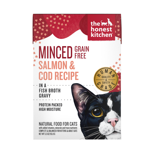 This box contains delicious, chunky, minced wild caught salmon and cod simmered in savory gravy. This gourmet fish in gravy recipe is made with 100% human grade ingredients and is free of fillers. Meaning it checks all your quality & nutrition boxes, and all your cat's taste & texture boxes (and we know how much cats love boxes!)