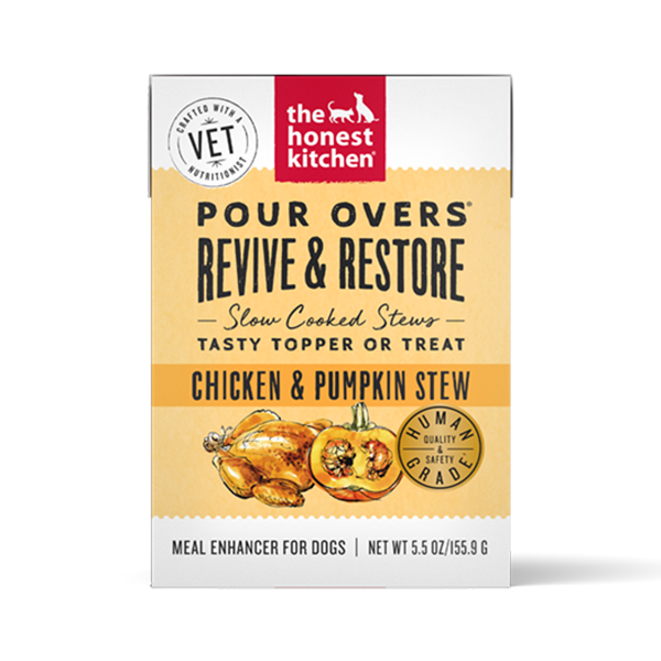 The Honest Kitchen Pour Overs Revive & Restore are human grade, tasty pourable stews full of cage free chicken simmered in a bone broth reduction that boost your pup's bowl with an extra helping of protein for extra taste appeal, as well as a boost of antioxidants and vitamins that help support a normal recovery. With just a few ingredients and an easy-to-use box, you can easily boost their bowl every day with this tasty meal topper.