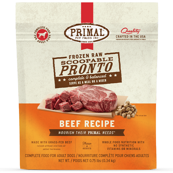 Primal Pronto Beef Formula for dogs is a revolutionary way to feed raw foods to your pet. With its small bite-sized pieces, it's easy to portion. And because Primal Pronto is a complete and balanced diet, there's nothing more to add. Just scoop and serve. Primal Pronto thaws in minutes! It's the same formulation as their raw frozen formulas, but in a bite-sized, quick-thaw format. Raw feeding doesn't get any easier than this.