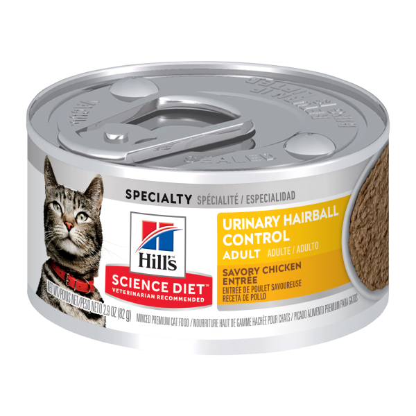 No one likes hairballs - especially your adult cat. That's why Hill's Science Diet Adult Urinary Hairball Control Savory Chicken Entrée wet cat food provides nutrition to help avoid hairball formation for adult cats. This cat food made with natural ingredients uses optimized levels of magnesium to support a grown cat's entire urinary system - from kidneys to bladder - while easily digestible natural fibers comfortably reduce hairball issues. Real chicken gives your cat quality protein for muscle maintenance while omega-3 and omega-6 fatty acids nourish the skin and fur.