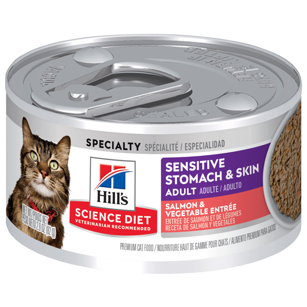 Hill's Science Diet Adult Sensitive Stomach & Salmon & Vegetable Entrée canned cat food provides nutrition for optimal digestive & skin health for optimal nutrient absorption & easy stool pick-up. Prebiotic fiber helps to fuel beneficial gut bacteria & support a balanced microbrome. Also has Vitamin E & Omega-6s for skin nourishment. With soft purrs and even softer nuzzles, you and your cat have a love that is all your own.