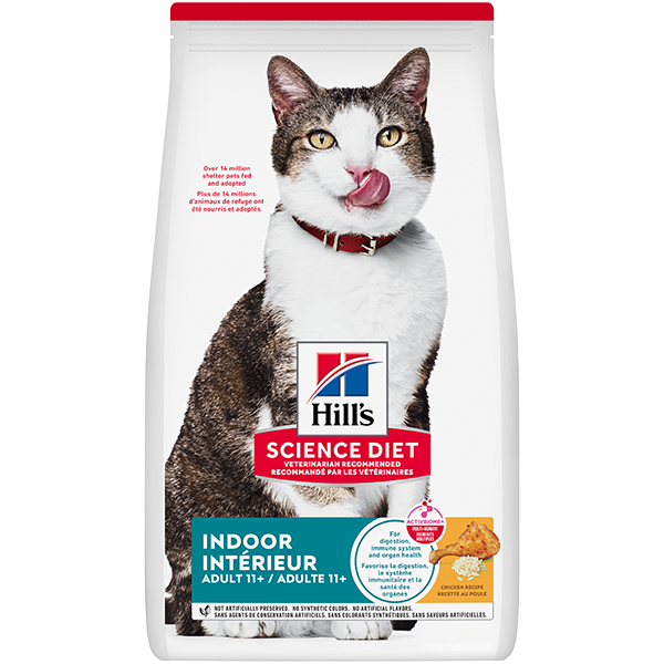 Your may have an older cat, but their need for love and interaction doesn't change. Hill's Science Diet Indoor Adult 11+ dry cat food is specially formulated to fuel the energy needs of cats with an indoor lifestyle during their golden years. This mature cat food made from natural ingredients contains optimal levels of nutrients for eyesight, heart health, kidney health, and joint health. Natural fibers and easy-to-digest ingredients are used to help an older cat's digestion and support easier litter box clean up.