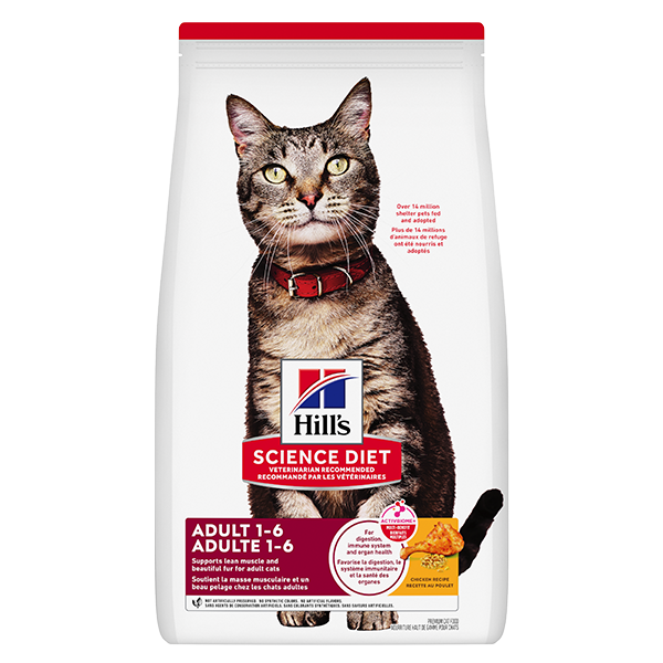 Your adult cat needs a pet food that supports healthy digestion, shiny fur, lean muscles, and a healthy immune system. Hill's Science Diet Adult dry cat food is made with high-quality, easy-to-digest ingredients and is specially formulated to fuel the energy needs of cats during the prime of their life. Made with natural ingredients, this premium cat food provides vitamin E plus omega-3 and omega-6 fatty acids to nourish your cat's skin. High-quality protein helps maintain lean muscles, while essential taurine and balanced minerals support heart health, bladder function and kidney function.