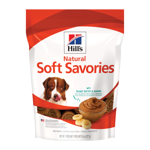 Hill's Natural Soft Savories with Peanut Butter & Banana dog treats are delicious, natural, and made from only the best ingredients. The soft and tender texture paired with a medley of fun rich flavors will make a dog happy. Not artificially preserved or flavored.