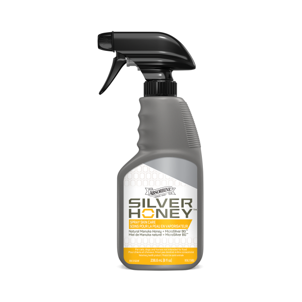 Combining the natural power of Manuka Honey and MicroSilver BG, Silver Honey Wound Care Spray Gel for dogs is tough on bacteria but gentle on skin. Proven to stop 99.9% of bacteria immediately to start healing faster, its revolutionary formula provides long-lasting protection and moisturizes the treatment area. Fast-acting antibiotic-free treatment of hot spots, dermatitis, cuts, abrasions, sores, rashes and lesions. The spray gel is designed to stay in place while providing continuous coverage to the wound. Its touch-free application is ideal for treating larger areas of the skin.
