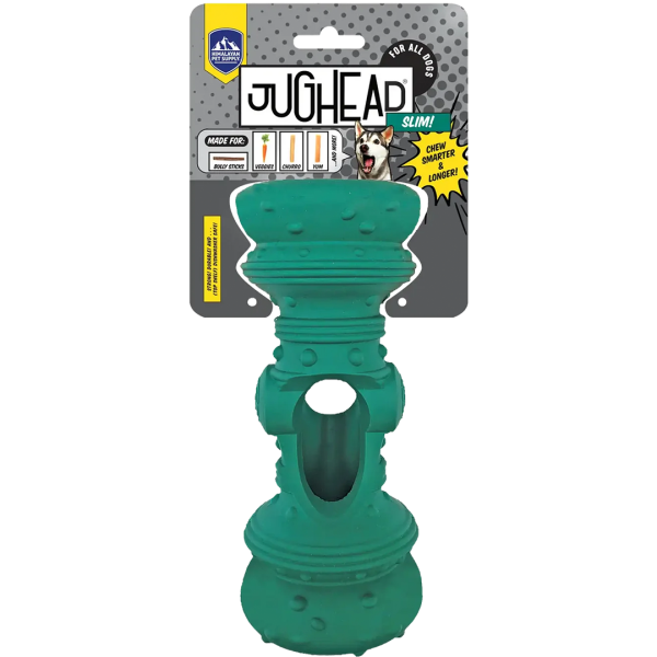 Does your dog chew & swallow things faster than a speeding bullet?! The Jughead Slim is here to save the day! It protects your dog against speedy chew chomping and even extends the life of the chew. Chew smarter & longer! The Jughead Slim is powerful, puzzling, and protective! The Jughead Slim is engineered to fit bully sticks, Himalayan Dog Chew YUM, and Churro treats. You can also use other forms of treats like apples or carrots. Simply insert your chew into the center of the Jughead Slim and get ready for your dog to enjoy and have fun!