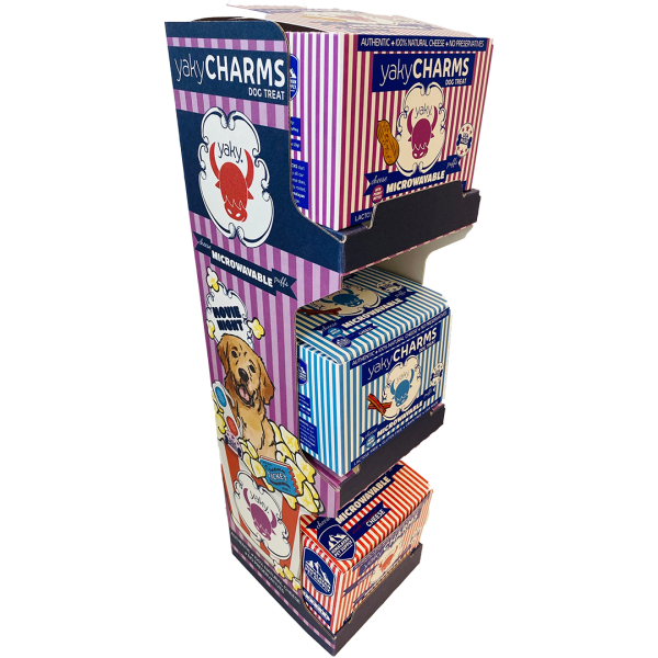 The Himalayan Dog Chew YakyCharms 3 Tier POP Display Unit contains 1 - 12pk of each flavour: Cheese, Bacon, and Peanut Butter. Enjoy movie night with your furry BFF! yakyCHARMS are a delightful cheesy snack your dog will love! These bite-sized treats are light, microwaveable cheese snacks that come in a popcorn-style bag!