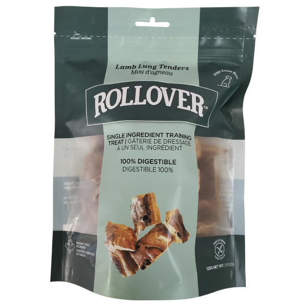 Canadian Brand. Rollover Lamb Tenders are 100% natural baked lamb lung with no added ingredients. Lung is an excellent source of vitamins, minerals and protein, making these pure lung treats not only tasty but nutritious. These small bite-sized pieces make an excellent training reward and everyday 'good dog' treat. Each 125g bag is resealable to ensure a quality fresh product.