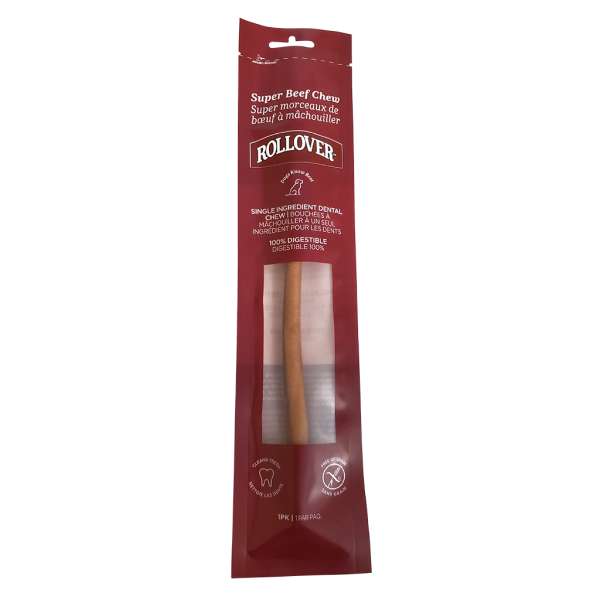 Canadian Brand. Rollover 11" Super Beef Chew is a 100% digestible beef pizzle that is baked, with no added ingredients, to be a completely natural, high protein, low fat chew treat. Each chew is individually packaged to ensure quality and freshness. These super chews tend to last longer due to their thickness and length.
