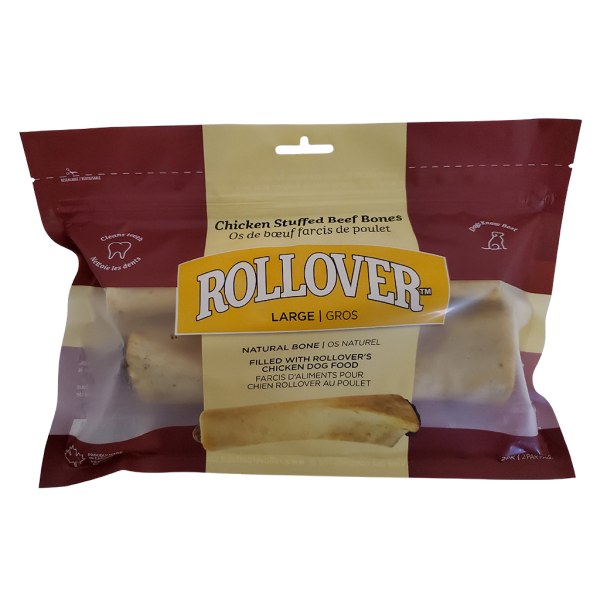 Canadian Brand. Rollover Large Chicken Stuffed Beef Bones are all-natural, cleaned beef bones that are stuffed with our premium Chicken dog food and baked for your dog's enjoyment. Beef bones, the hardest available, are a good way to satisfy that natural urge to chew and with a centre of delicious Rollover Chicken dog food, dogs will work to get at the tasty middle, making these bones longer-lasting chews. Each bone is approximately 8-9" in length, 2.5" in diameter and individually shrink-wrapped to ensure freshness. This 2pk is a great value.