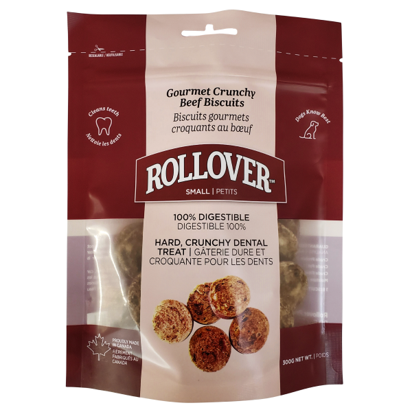 Canadian Brand. Rollover Small Gourmet Beef Biscuits are made directly from their all-natural Beef dog food, sliced and baked to be a nutritious treat. As with our premium Beef dog food, they are completely natural. These biscuits are hard - and are meant to be - so that your dog receives the full dental benefits while enjoying this nutritious, tasty treat. Each small biscuit is approximately 1.5" in diameter and these are packaged in a completely resealable bag to maintain freshness.