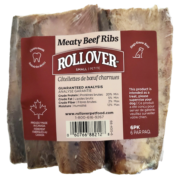 Canadian Brand. Rollover Small Meaty Beef Rib Bones are all-natural beef rib bones with the meat on the outside and baked for your dog's chewing enjoyment. Small Meaty Beef Rib bones are approximately 4 - 5" long, a thinner bone makes the Meaty Beef Rib a nice option for delicate chewers. Each package contains 6 individually shrink-wrapped Small Meaty Beef Rib Bones, sealed to ensure freshness. A great value item!