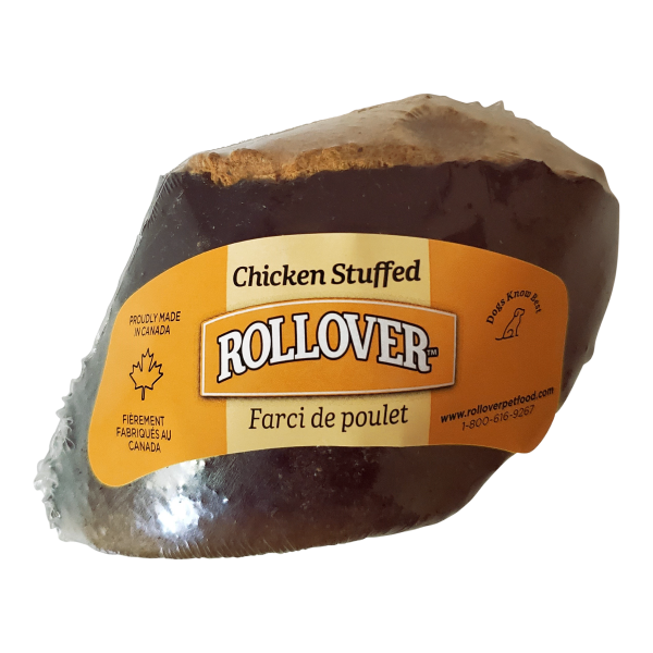 Canadian Brand. Rollover Chicken Stuffed Beef Hooves are all-natural, cleaned beef hooves that are filled with our premium Chicken dog food and baked for your dog's enjoyment. These treats are a good way to satisfy the natural urge to chew, while helping to clean teeth, and dogs love the smell and taste! Each hoof is shrink-wrapped to ensure freshness.