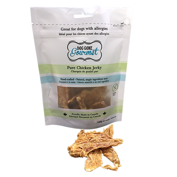 Canadian Brand. Dog Gone Gourmet Pure Chicken Jerky are a natural, single ingredient treat hand-crafted in Canada. They're grain-free and a great choice for dogs with allergies. Pure Chicken Jerky is perfect for training, rewarding, and spoiling!