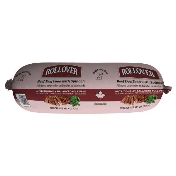 Canadian Brand. Rollover's NEW Beef Dog Food with Spinach is made with Alberta beef organ meats blended with Canadian whole grains and Spinach, a super food that contains high amounts of vitamins as well as iron, antioxidants and beta-carotene. This food is completely natural and made with ingredients from human-grade facilities. Rollover makes all its food in its dedicated facility in High River, AB in small, hand-made batches, ensuring great care is taken with every food made. This can be fed as a complete meal or as a supplement to dry. It can even be used as treats!