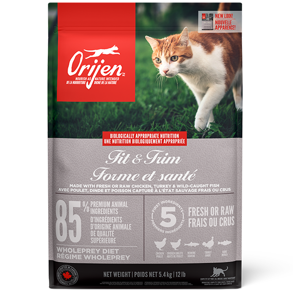 Canadian Brand. Help your cat thrive with the power of protein-rich recipes that provide peak nourishment. ORIJEN Fit & Trim diet is optimized to support lean muscle mass and is specifically designed to support peak physical conditioning with quality ingredients from fresh or raw chicken, turkey & wild-caught fish. With rich inclusions of WholePrey animal ingredients, ORIJEN Fit & Trim diet is made with the most nutrient-dense, succulent parts of the prey to deliver the lean nutrition cats need. With 85% quality animal ingredients & a freeze-dried liver coating, this diet is beyond comparison.