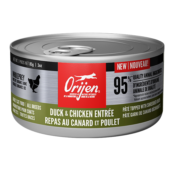 Canadian Brand. ORIJEN Wet Cat Food is a super premium paté packed with WholePrey animal ingredients. ORIJEN Duck & Chicken Entrée includes raw WholePrey ingredients like poultry, organs, and bone that provide the protein, nutrients, and minerals your cat needs to be their best. The first 7 ingredients in this wet cat food diet are raw duck and chicken ingredients. Packed with 95% animal ingredients and no peas, lentils, legumes, carrageenan, or gums, ORIJEN Wet Cat Food provides the nourishment your cat needs to thrive.