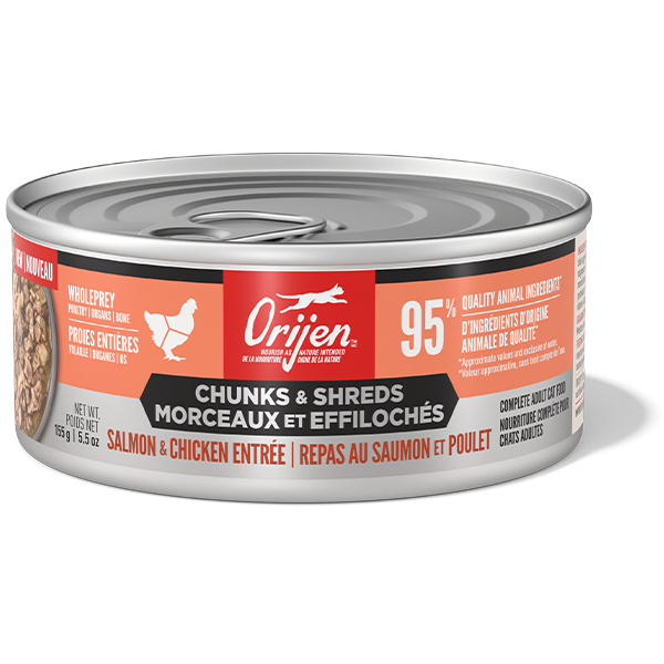 Canadian Brand. Nourish your cat completely with hearty WholePrey animal ingredients and real shreds of meat, poultry or fish in ORIJEN Chunks & Shreds Wet Cat Food! Cats are obligate carnivores & thrive off a diet packed with animal ingredients. Salmon & Chicken Entrée recipe includes 95% animal ingredients to provide your cat with the Biologically Appropriate nourishment they were born to eat. This diet also includes succulent WholePrey ingredients like chicken liver to provide rich and varied nutrients. Bone broth helps support your cat's hydration, while also adding tempting flavour.