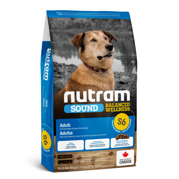 Canadian Brand. S6 Nutram Sound Balanced Wellness Adult Dog Food is a holistic, multi-beneficial, and nutrient-rich recipe that improves your pet's wellness from the inside-out. Their Holistic approach starts with digestion. Peas and Apples are both low-glycemic, high fiber ingredients. Fiber aids the movement of food through the digestive system, and creates the feeling of fullness, keeping your pet satisfied for longer. This combined with a blend of Flaxseed and Salmon Oil, rich in Omega-3 fatty acids, allows Nutram's Optimum Combinations to provide the nutrients that support healthy skin and a shiny coat.
