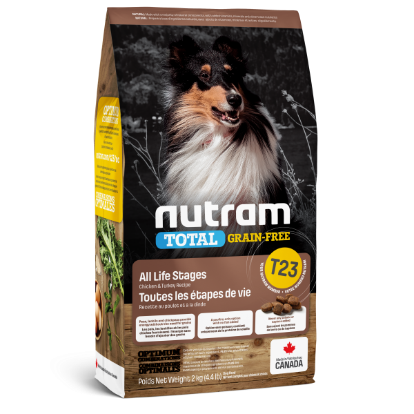 Canadian Brand. T23 Nutram Total Grain-Free Chicken & Turkey Recipe Dog Food is a holistic, multi-beneficial, and nutrient-rich recipe that improves your pet's wellness from the inside-out. Wholesome ingredients such as low-glycemic lentils, peas and chickpeas provide a source of healthy carbs and quality protein. This, combined with kale, a rich source of phytonutrients, and peppermint helps the body to naturally and gently detoxify. Quinoa, a low-glycemic nutrient dense food, combined with whole eggs, a highly digestible protein source, provides the body with all the tools it needs for strong muscles.