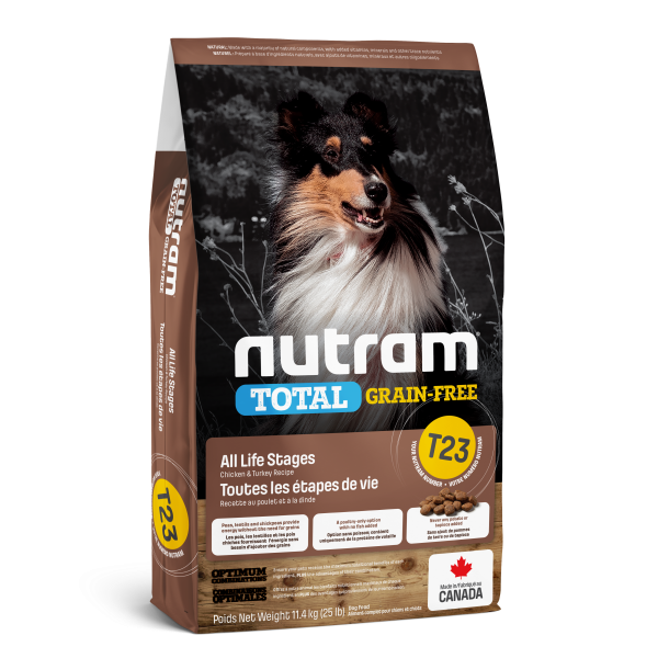 Canadian Brand. T23 Nutram Total Grain-Free Chicken & Turkey Recipe Dog Food is a holistic, multi-beneficial, and nutrient-rich recipe that improves your pet's wellness from the inside-out. Wholesome ingredients such as low-glycemic lentils, peas and chickpeas provide a source of healthy carbs and quality protein. This, combined with kale, a rich source of phytonutrients, and peppermint helps the body to naturally and gently detoxify. Quinoa, a low-glycemic nutrient dense food, combined with whole eggs, a highly digestible protein source, provides the body with all the tools it needs for strong muscles.