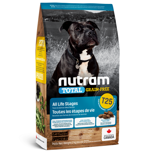 Canadian Brand. T25 Nutram Total Grain-Free Trout and Salmon Meal Recipe Dog Food is a holistic, multi-beneficial, and nutrient-rich recipe that improves your pet's wellness from the inside-out. A blend of low-glycemic Peas, Chickpeas & Lentils provides a source of healthy carbs and quality protein. This, combined with Kale, a rich source of phytonutrients, and Peppermint, a soothing herb, helps the body to naturally and gently detoxify. Nutram's Optimum Combinations offers a blend of Blueberries and Blackberries, rich sources of powerful antioxidants, which help boost the immune system and promote vitality.