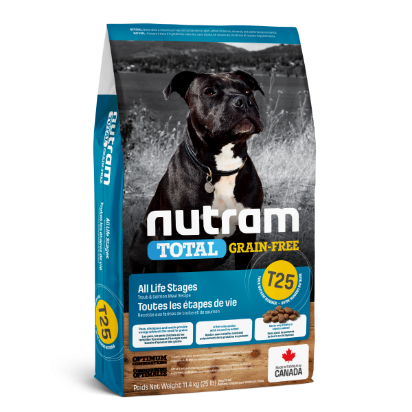 Canadian Brand. T25 Nutram Total Grain-Free Trout and Salmon Meal Recipe Dog Food is a holistic, multi-beneficial, and nutrient-rich recipe that improves your pet's wellness from the inside-out. A blend of low-glycemic Peas, Chickpeas & Lentils provides a source of healthy carbs and quality protein. This, combined with Kale, a rich source of phytonutrients, and Peppermint, a soothing herb, helps the body to naturally and gently detoxify. Nutram's Optimum Combinations offers a blend of Blueberries and Blackberries, rich sources of powerful antioxidants, which help boost the immune system and promote vitality.
