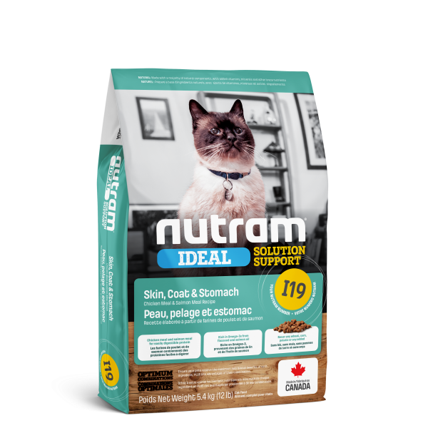 Canadian Brand. I19 Nutram Ideal Solution Support Skin, Coat and Stomach Cat Food is a holistic, multi-beneficial, and nutrient-rich recipe that improves your pet's wellness from the inside-out. Easily digestible protein sources, also rich sources of important Omega fatty acids, help promote healthy skin, while being easy on the digestive tract. This, combined with immune boosting properties of Salmon, a rich source of anti-inflammatory EPA, and Rosemary, a powerful anti-oxidant, allows Nutram's Optimum Combinations to promote the right environment for beautiful skin and a shiny coat.