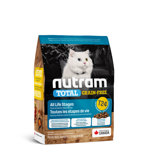 Canadian Brand. T24 Nutram Total Grain-Free Trout and Salmon Meal Recipe Cat Food is a holistic, multi-beneficial, and nutrient-rich recipe that improves your pet's wellness from the inside-out. Wholesome ingredients such as a blend of low-glycemic peas, lentils and chickpeas supply a source of healthy carbs and quality protein. This, combined with a blend of turmeric and salmon oil, provides immune boosting properties to help support a strong immune system. Cranberries and celery seeds help maintain healthy fluid levels, working together with proper pH and moderate ash levels to support a healthy bladder.