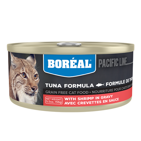 Canadian Brand. Boréal canned cat foods are 95% meat and are designed to have almost no carbohydrates to lower the risk of unwanted weight gain. This Red Tuna formula is made with dark muscle red tuna meat in gravy, and is topped with shrimp. Like all their canned cat foods, it is free of cereals, grains, artificial colour, or added salt. The Red Tuna line is not produced in Canada but in Thailand. It is produced in a facility that also produces food for humans, which are marketed all over the world.
