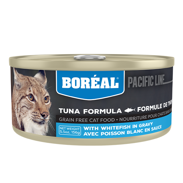 Canadian Brand. Boréal canned cat foods are 95% meat and are designed to have almost no carbohydrates to lower the risk of unwanted weight gain. This Red Tuna formula is made with dark muscle red tuna meat in gravy, and is topped with white fish. Like all their canned cat foods, it is free of cereals, grains, artificial colour, or added salt. The Red Tuna line is not produced in Canada but in Thailand. It is produced in a facility that also produces food for humans, which are marketed all over the world.
