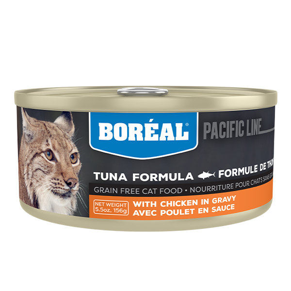 Canadian Brand. Boréal canned cat foods are 95% meat and are designed to have almost no carbohydrates to lower the risk of unwanted weight gain. This Red Tuna formula is made with dark muscle red tuna meat in gravy, and is topped with chicken. Like all their canned cat foods, it is free of cereals, grains, artificial colour, or added salt. The Red Tuna line is not produced in Canada but in Thailand. It is produced in a facility that also produces food for humans, which are marketed all over the world.