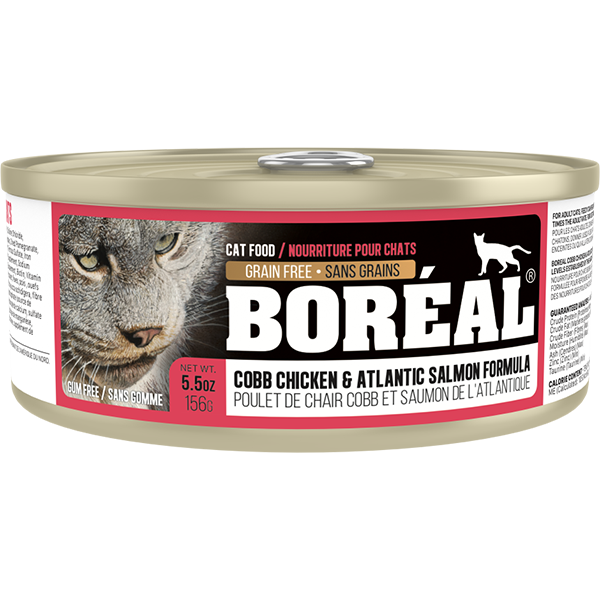 Canadian Brand. Boréal canned cat foods have 95% of the protein from Meat/Fish and are designed to have almost no carbohydrates or starches. This Canadian-made line is gum free and gluten free. The Cobb Chicken and Atlantic Salmon cat food is made from Canadian chicken and farm raised Atlantic salmon. It is made with no cereals, grains, artificial colour, gums or thickeners added. Zinc and manganese are added as they are important for skin health and coat quality. This includes better hair coat length and shine, and enhanced skin integrity and wound healing.