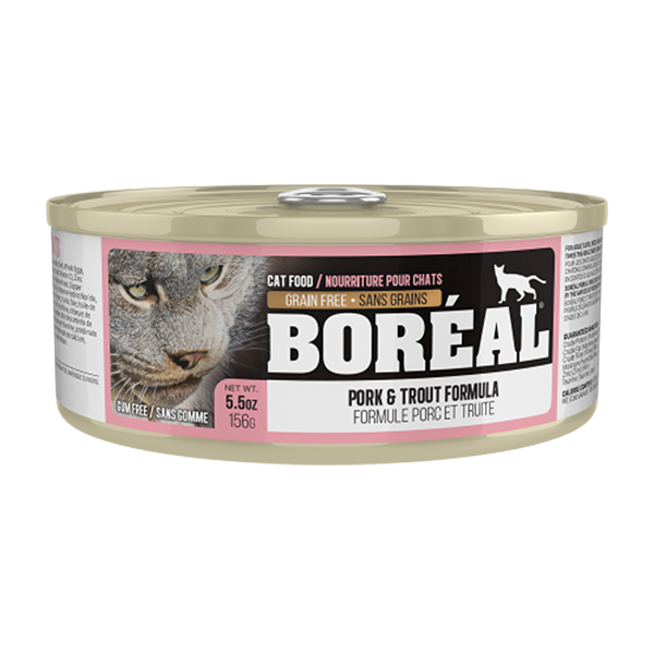 Canadian Brand. Boréal canned cat foods have 95% of the protein from Meat/Fish and are designed to have almost no carbohydrates or starches. This Canadian-made line is gum free and gluten free. The Pork and Trout cat food is made from Canadian pork and trout. It is made with no cereals, grains, artificial colour, gums or thickeners added. Zinc and manganese are added as they are important for skin health and coat quality. This includes better hair coat length and shine, and enhanced skin integrity and wound healing.
