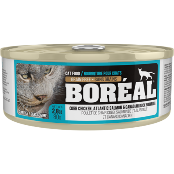 Canadian Brand. Boréal canned cat foods have 95% of the protein from Meat/Fish and are designed to have almost no carbohydrates or starches. This Canadian-made line is gum free and gluten free. The Cobb Chicken, Canadian Duck and Atlantic Salmon cat food is made from Canadian chicken and duck and farm raised Atlantic salmon. It is made with no cereals, grains, artificial colour, gums or thickeners added. Zinc and manganese are added as they are important for skin health and coat quality. This includes better hair coat length and shine, and enhanced skin integrity and wound healing.