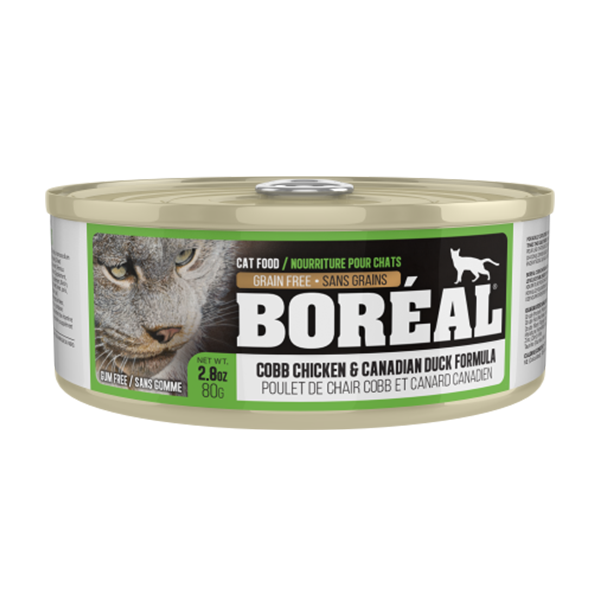Canadian Brand. Boréal canned cat foods have 95% of the protein from Meat/Fish and are designed to have almost no carbohydrates or starches. This Canadian-made line is gum free and gluten free. The Cobb Chicken and Canadian Duck cat food is made from Canadian chicken and duck. It is made with no cereals, grains, artificial colour, gums or thickeners added. Zinc and manganese are added as they are important for skin health and coat quality. This includes better hair coat length and shine, and enhanced skin integrity and wound healing.