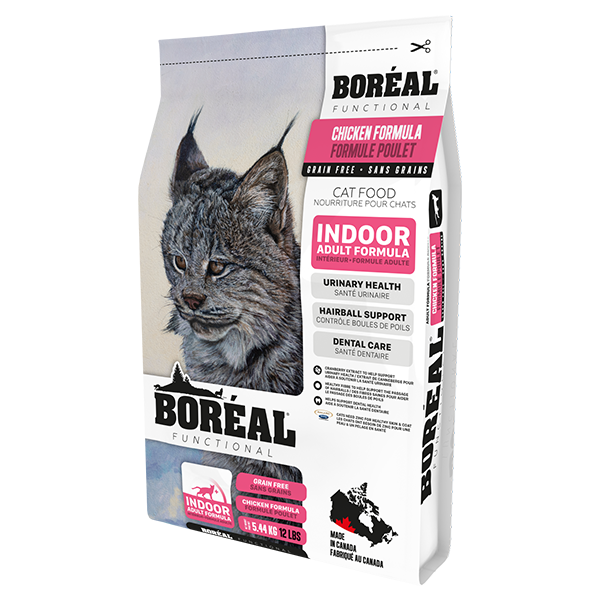 Canadian Brand. Boréal strives to make the best food for every dog and cat. Every possible ingredient is sourced from Canadian farms and fisheries. Boréal Functional Indoor Cat is a high meat, low carb, grain free food with a focus on low glycemic ingredients to help keep your cat healthy. High quality fresh, deboned chicken is the first ingredient. Functional Indoor is designed to support Urinary Health, Hairball support, & Dental support.