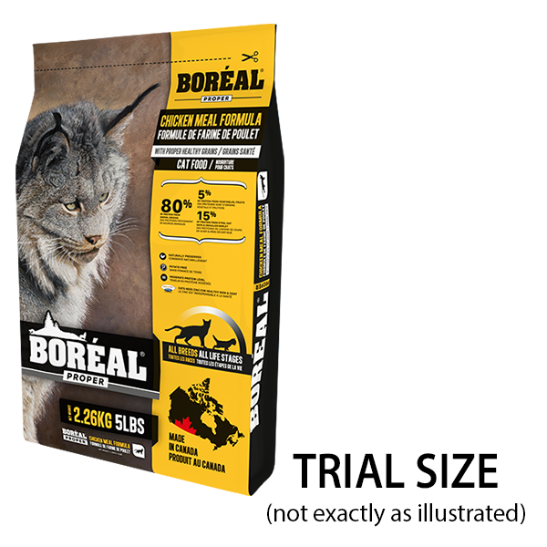Canadian Brand. Boréal Proper is a grain inclusive food using oats and barley, both low glycemic index 'good grains'. Boréal Proper Chicken Cat is a high meat, low carb food with low glycemic index oats and barley. Every possible ingredient is sourced from Canadian farms and fisheries. Oats & Barley are slow to digest grains, which cat help cat feel fuller for longer, aiding in weight management. It includes prebiotics to help with digestion and taurine for a healthy heart.