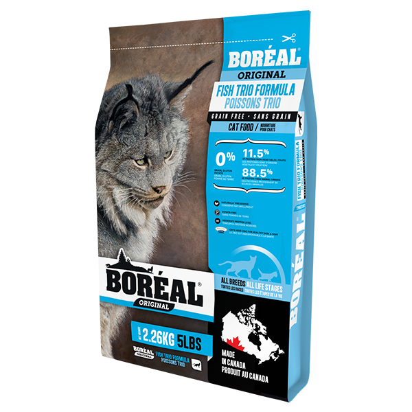Canadian Brand. Boréal Original Fish Trio is a high meat, low carb, grain free food with a focus on low glycemic ingredients to help keep your cat healthy. Every possible ingredient is sourced from Canadian farms and fisheries. Boréal Original Fish Trio is an everyday diet which can be used to help keep your cat at a healthy weight, with high quality fresh, deboned salmon as the first ingredient. It includes prebiotics to help with digestion, botanicals for gut health & antioxidants, and taurine for a healthy heart.