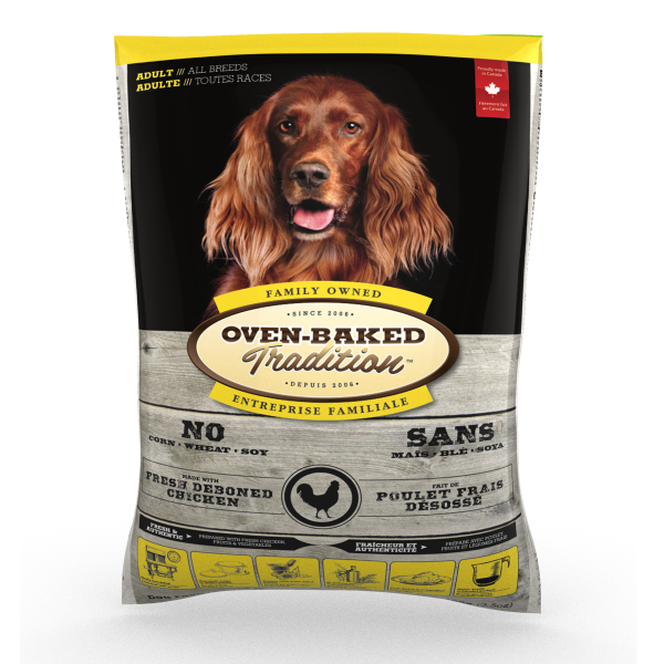 Canadian Brand. Oven-Baked Tradition's adult dog food is slowly oven-baked at low temperature to bring out the ingredients' flavors while preserving the integrity of essential nutrients and proteins. It's made in small batches to ensure freshness and quality. Fresh chicken is the first ingredient along with fruits & vegetables. It contains whole grains milled in-house and is made without wheat, corn or soy and has no artificial flavors or preservatives.
