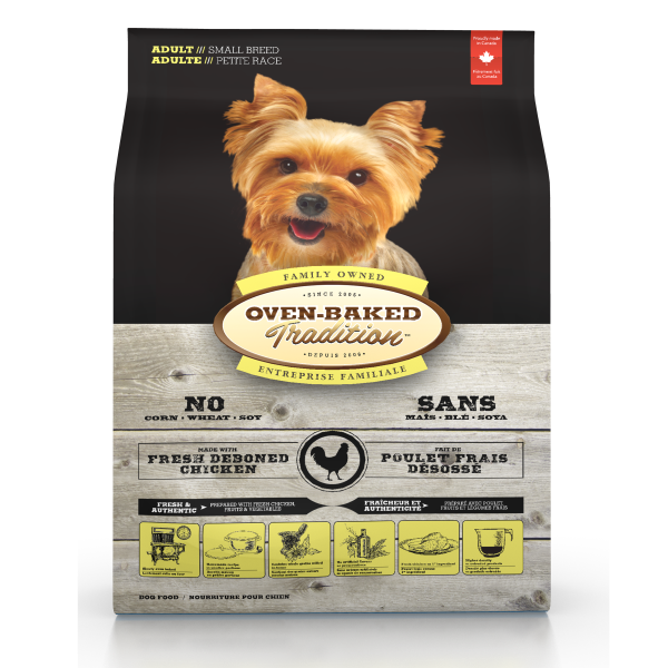 Canadian Brand. Oven-Baked Tradition's adult dog food for small breeds is slowly baked at low temperature so that your dog can reap all the benefits of fresh food in terms of taste and nutrients. Their small breed adult dog food does not contain wheat, corn, soy, artificial flavourings or preservatives and is made with fresh meat as first ingredient as well as with specially selected fruits and vegetables. The high density of Oven-Baked Tradition adult dog food allows your pet to feel full with smaller portions.