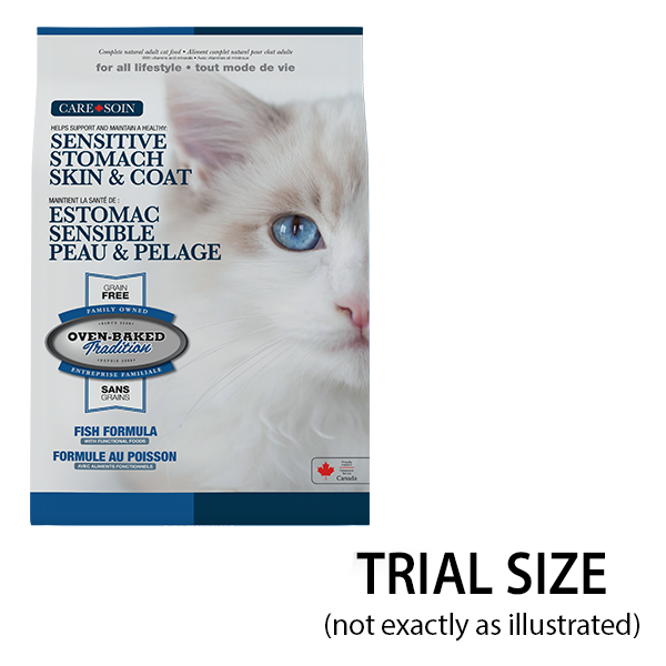 Canadian Brand. Oven-Baked Tradition Sensitive Stomach, Skin & Coat, Grain-free cat food is made with fresh fish, fruits and vegetables. This preventive formula has been specially designed for both indoor and outdoor adult cats. It contains functional ingredients that work synergistically to support stomach, skin & coat health. Grain-free, and enriched with essential vitamins and minerals, it offers complete daily support.