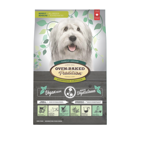 Canadian Brand. Oven-Baked Tradition Adult Vegan Dog Food is made with 0% meat inclusion. It's formulated to meet the nutritional needs of adult dogs of all breeds and those with intolerance (allergies) to meat. It's made with natural ingredients and is supplemented with vitamins, minerals, and amino acids such as DL methionine and taurine for better bioavailability of nutrients.