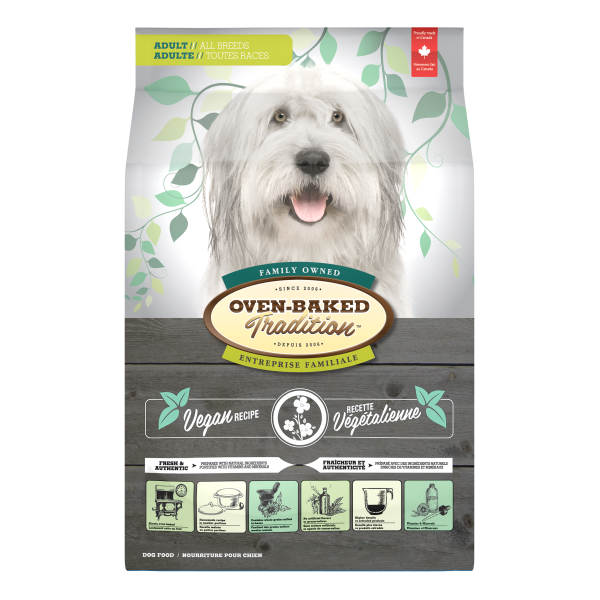 Canadian Brand. Oven-Baked Tradition Adult Vegan Dog Food is made with 0% meat inclusion. It's formulated to meet the nutritional needs of adult dogs of all breeds and those with intolerance (allergies) to meat. It's made with natural ingredients and is supplemented with vitamins, minerals, and amino acids such as DL methionine and taurine for better bioavailability of nutrients.
