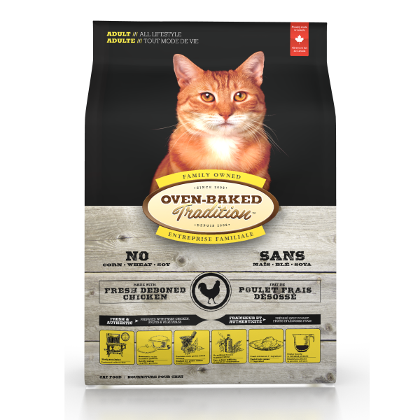 Canadian Brand. Oven-Baked Tradition Chicken formula for Adult Cats has been formulated for adult cats (indoor or outdoor). With chicken as the first ingredient, this recipe is prepared with fresh fruits and vegetables. This homemade recipe is prepared in smaller portions and slowly oven baked. It contains whole grains milled in-house and is made with no artificial flavors or preservatives. It's perfectly balanced and ideal for maintenance.