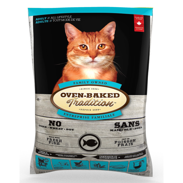 Canadian Brand. Oven-Baked Tradition Fish formula for Adult Cats has been formulated for adult cats (indoor or outdoor). With fish as the first ingredient, this recipe is prepared with fresh fruits and vegetables. This homemade recipe is prepared in smaller portions and slowly oven baked. It contains whole grains milled in-house and is made with no artificial flavors or preservatives. It's perfectly balanced and ideal for maintenance.
