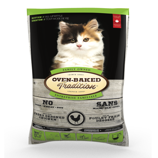 Canadian Brand. Oven-Baked Tradition Chicken formula for Kittens has been formulated for kittens (indoor or outdoor). With chicken as the first ingredient, this recipe is prepared with fresh fruits and vegetables. This homemade recipe is prepared in smaller portions and slowly oven baked. It contains whole grains milled in-house and is made with no artificial flavors or preservatives. It's perfectly balanced for ideal development.