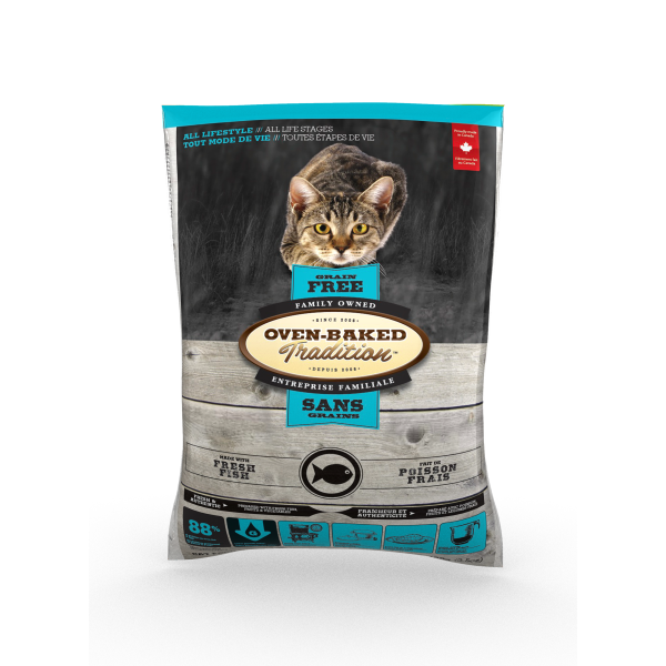 Canadian Brand. Oven-Baked Tradition Grain-Free Fish formula for Cats has been formulated for kittens, adults and senior cats (indoor or outdoor). This grain-free recipe is prepared with fresh fish, fruits and vegetables. It features a lower glycemic index and is slowly oven baked in smaller portions.