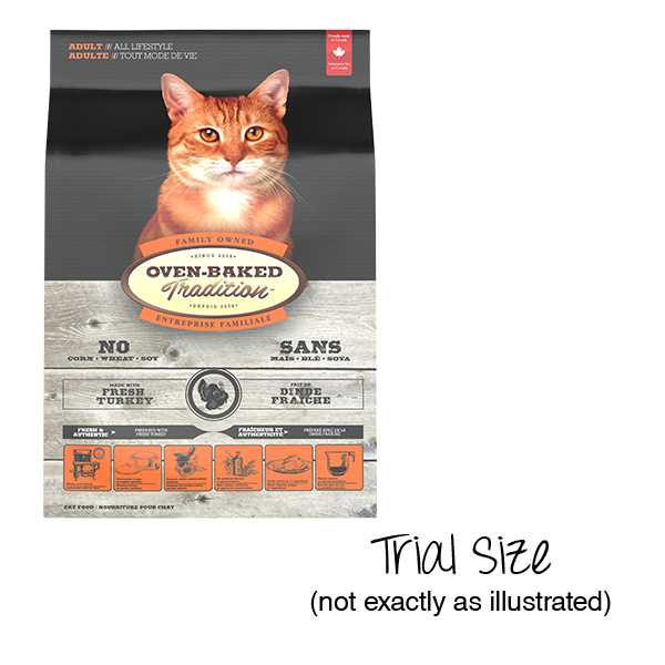 Canadian Brand. Oven-Baked Tradition Turkey formula for Cats has been formulated for adult cats (indoor or outdoor). It's perfectly balanced and ideal for maintenance. Fresh deboned turkey provides a well-balanced amino acid content to foster the development of healthy body tissues. Omega-3 & 6 fatty acids promote supple skin and a shiny, silky coat while glucosamine & chondroitin contribute to the hydration of the cartilage to protect joints. Cranberries provide a source of antioxidants and pineapple helps prevent hairball build up. It contains whole grains and is slowly oven baked in smaller portions.